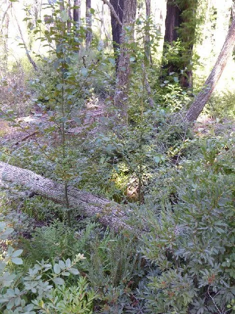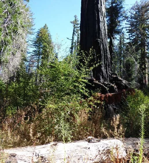 This shrub-like growth surrounding a dead tree trunk is a tan oak sprout. Like redwoods, tan oaks will sprout new shoots from the base even though the top was killed by fire. Many other trees and shrubs in California have this adaptation. This means that in spite of above-ground damage, the individual plant can survive and continue to grow for centuries. However, it will be many years before the new tree will produce significant shade and acorns, an important wildlife food item. In the meantime, animal numbers will be suppressed. Animals relying heavily on acorns include squirrels, chipmunks, jays, band-tailed pigeons, and acorn woodpeckers.