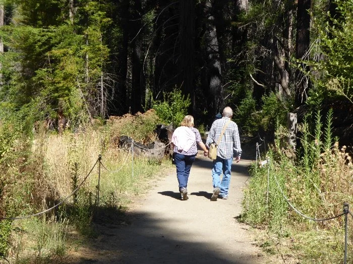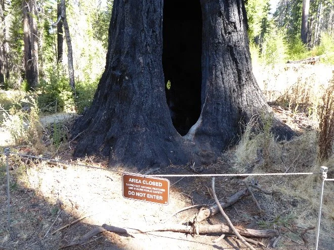 Take the short spur trail to the Mother Tree. It is 262 feet tall and its base has been hollowed out by successive fires over the centuries to form a large cavity called a “goose pen”. In 2020, the fire burned so tenaciously inside this tree that fire-fighters had to pour 50,000 gallons of water on it to put it out. Before the fire the height of the Mother was 293 feet. ATer the fire its height is now 262 feet high. It is not unusual for redwoods to have their tops break off in a severe fire. Currently the tallest tree in the park, found elsewhere is 331 feet tall. We are pleased to report that it only lost 4 inches of its height in the 2020 fire.