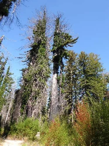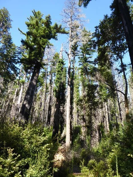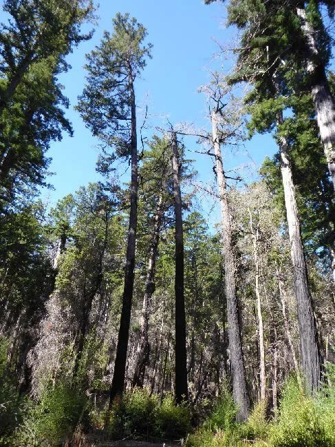 Look straight ahead to see the Father Tree. It is the tall tree on the right and the biggest tree in the park with a diameter of over 17 feet. It lost all its branches in the fire, including those used by nesting marbled murrelets — an endangered seabird that nests in old-growth trees. Before the fire, this tree had a 24-inch diameter horizontal branch that was 135 feet above the ground and supported a murrelet nest for several years. That branch, and others like it, have burned away, and it may take more than 200 years for suitable replacement branches to form.