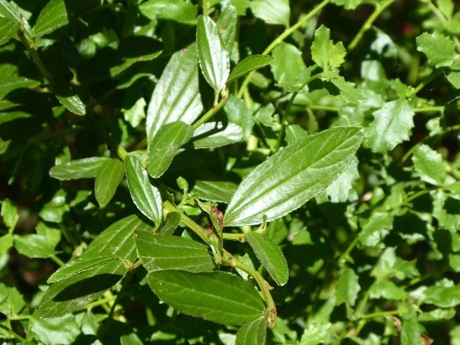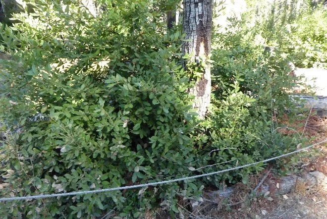 On the left is a large redwood with many burls growing around its base. It is called the Animal Tree because the burls resemble animal heads. Growing in front of it and difficult to see well is a sun-loving native shrub called blue-blossom ceanothus. This is a sub-par specimen, but the location was easy to describe. Better specimens can be found further down the trail if you look for a tall shrub with glossy green leaves having three prominent parallel veins like this: