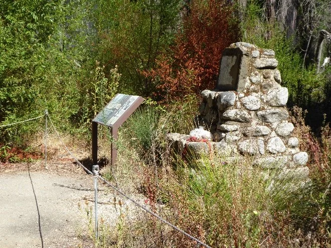 The small stone monument with a plaque missing from the top was a memorial to Andrew P. Hill. He, along with Carrie Stevens Walter, Josephine McCrackin, and others, fought to save the redwoods from logging. They started the movement to save Big Basin, but that fight still continues. A new, more insidious threat, human-caused climate change, is creating exceptionally severe fires that do great damage to the redwood forest community.