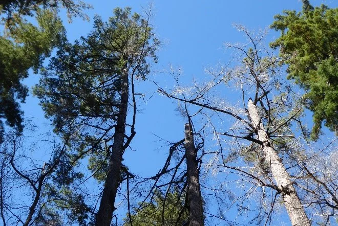 This fire-killed tree is a Douglas-fir. Oldgrowth Douglas-firs are resistant to most fires because they have a thick insulating bark not found in younger trees. However, the 2020 fire, being intensified by climate change, was not a “normal” fire to which they were adapted, and nearly all of them in Big Basin were killed by the fire. Unlike redwoods, they cannot sprout new stems or branches.