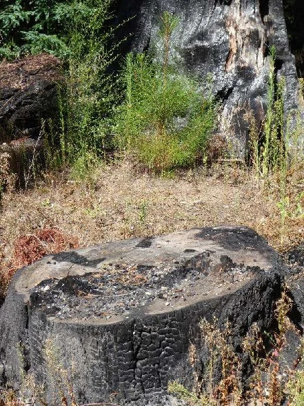 This redwood seedling grew from seed that germinated after the fire. The seed needs bare soil to grow in and is dependent on disturbances, like fire, to provide it.